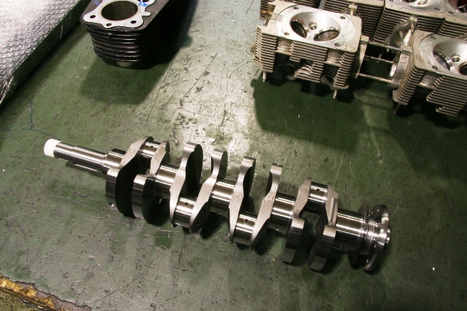 多工程を経過して出来上がった品物です。材質はクロモリのSNM440H材で製作し数回の熱処理とショットを施しています。このクランクはリアのオイルシール部分が普通のゴム系のオイルシールは使用せずに、ラビリンスシールになっています。ラビリンスシールとは、エンジンの回転によってオイルを欠き戻すようなネジ状の溝が切ってある構造なんです。このクランクはその溝も成形して製作しています。